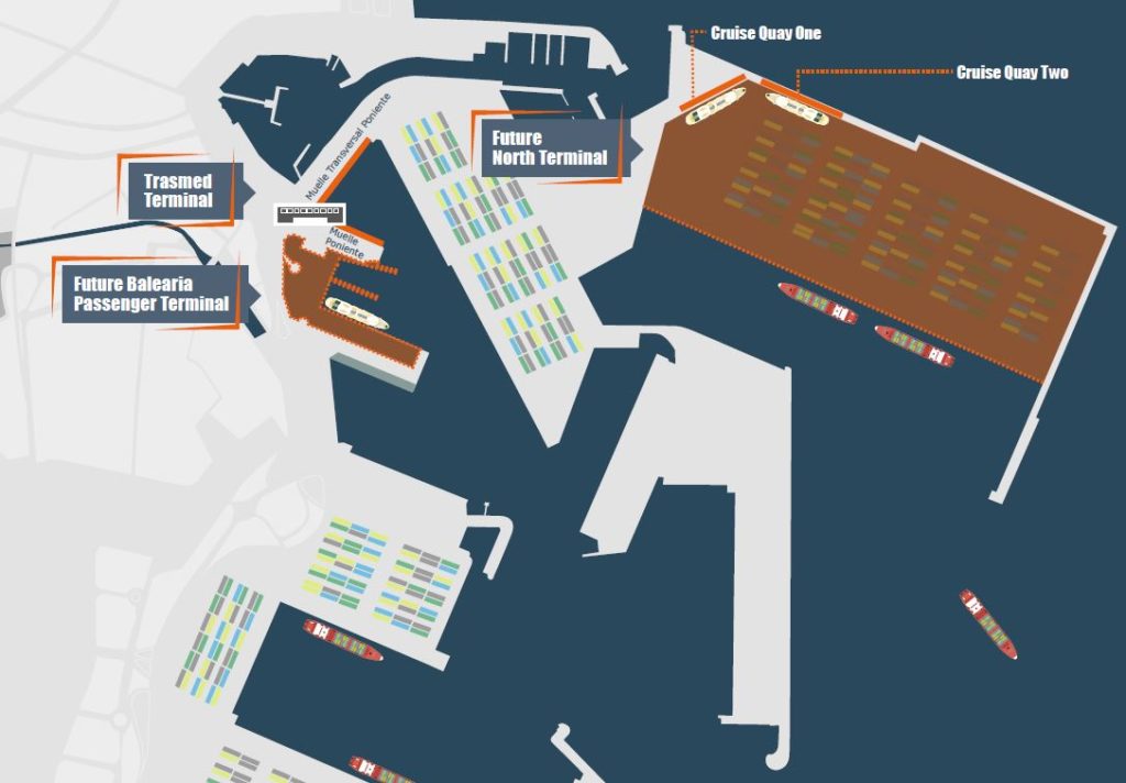 Valenciaport is adapting its facilities for container and cruise traffic. At the northern end of the port, until the end of 2024 the quays for serving large cruise ships (CRUCEROS 1 Quay and CRUCEROS 2 Quay), works have begun for the future North Container Terminal. Therefore, those quays are no longer available to serve cruise ships.